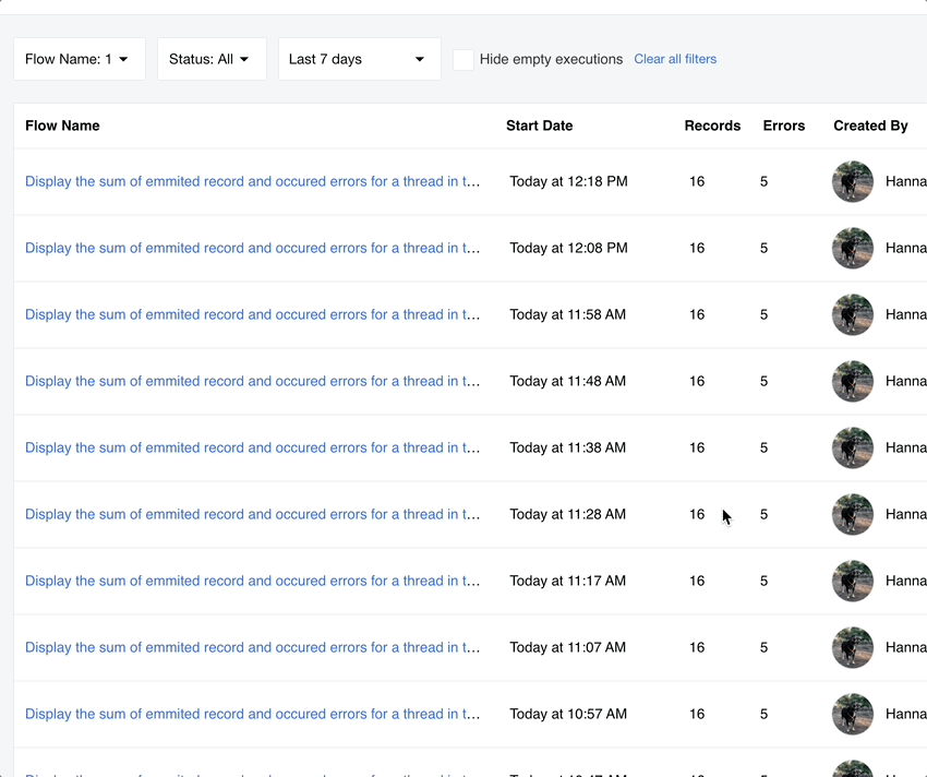 Example: Your flow consists of 4 components, with the execution containing 1 record in the 1st step, 2 records in the 2nd step, 1 error in the 3rd step, and 2 errors in the 4th step. Previously, the Execution page displayed only the largest numbers, showing 2 records and 2 errors. Now, the page will display a total of 3 records and 3 errors, accurately reflecting the total from all steps and the emitted messages and errors.